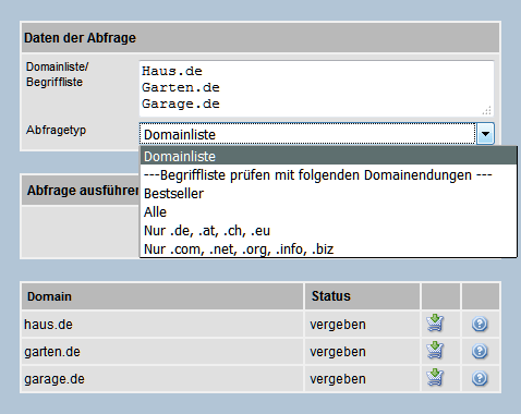 Mit der Domainabfrage prüfen Sie die Verfügbarkeit von Domainnamen. Wahlweise geben Sie die Domain-Endung vor oder lassen vom System die Verfügbarkeit verschiedener Endungen prüfen. Bei der Suche können neben Einzel-Domainnamen auch gleich mehrere eingegeben werden. Abfragetyp: DomainlisteEingabe von Domains mit Endung: Das System prüft exakt die eingegebenen Domainnamen ![]() Eingabe von Domains ohne Endung: Das System die eingegebenen Domainnamen mit den populärsten Endungen. ![]() Eingabe von Domains ohne Endung: Das System prüft die eingegebenen Domainnamen mit allen verfügbaren Endungen. Hinweis: Pro Domain werden sämtliche der derzeit über 600 verfügbaren Domainnamen geprüft. In Abhängigkeit von der Verbindungsgeschwindigkeit und der Anzahl der Domainnamen kann dieser Abfragetyp mehrere Minuten dauern. ![]() Eingabe von Domains ohne Endung: Das System prüft die eingegebenen Domainnamen mit den populärsten nationalen Endungen. ![]() Eingabe von Domains ohne Endung: Das System prüft die eingegebenen Domainnamen mit allen verfügbaren internationalen Endungen. ![]()