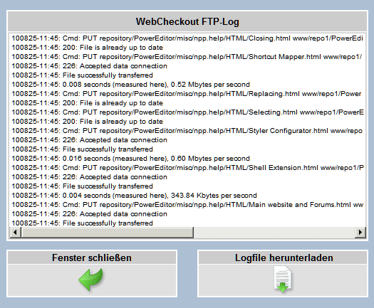 Nach Anklicken des Icons für das Logfile des Checkout-Prozesses öffnet sich ein separates Fenster mit dem Protokoll der FTP-Verbindung der letzten oder aktuell laufenden Ausführung in Echtzeit. Sollte Ihnen zum Beispiel der Status der letzten Ausführung in der Übersicht als Fehlerhaft angezeigt werden, dann kann das Logfile helfen eventuelle Fehlerquellen zu erkennen. Sollten Sie einen Fehler anhand des Logfiles nicht alleine Lösen können, wenden Sie sich einfach an den Support. ![]()